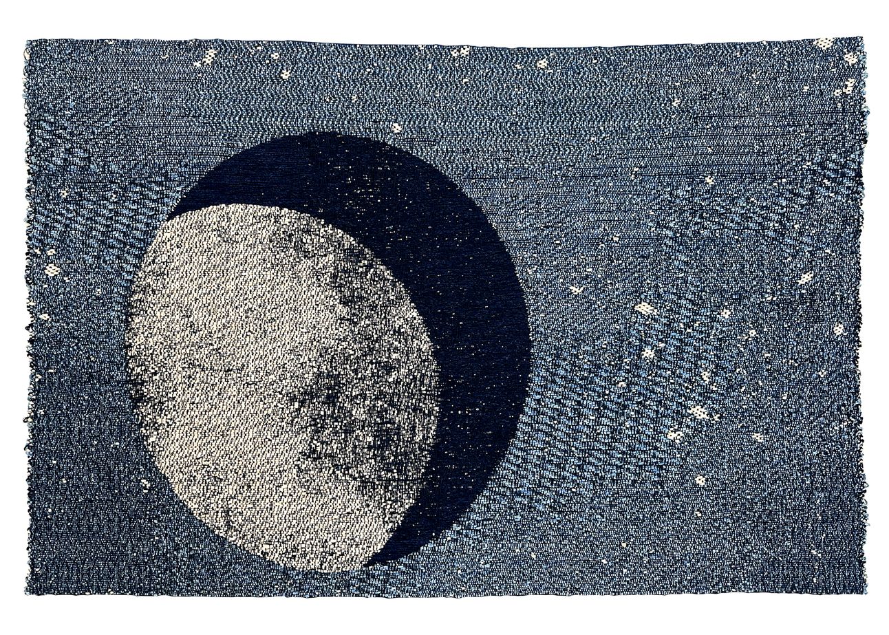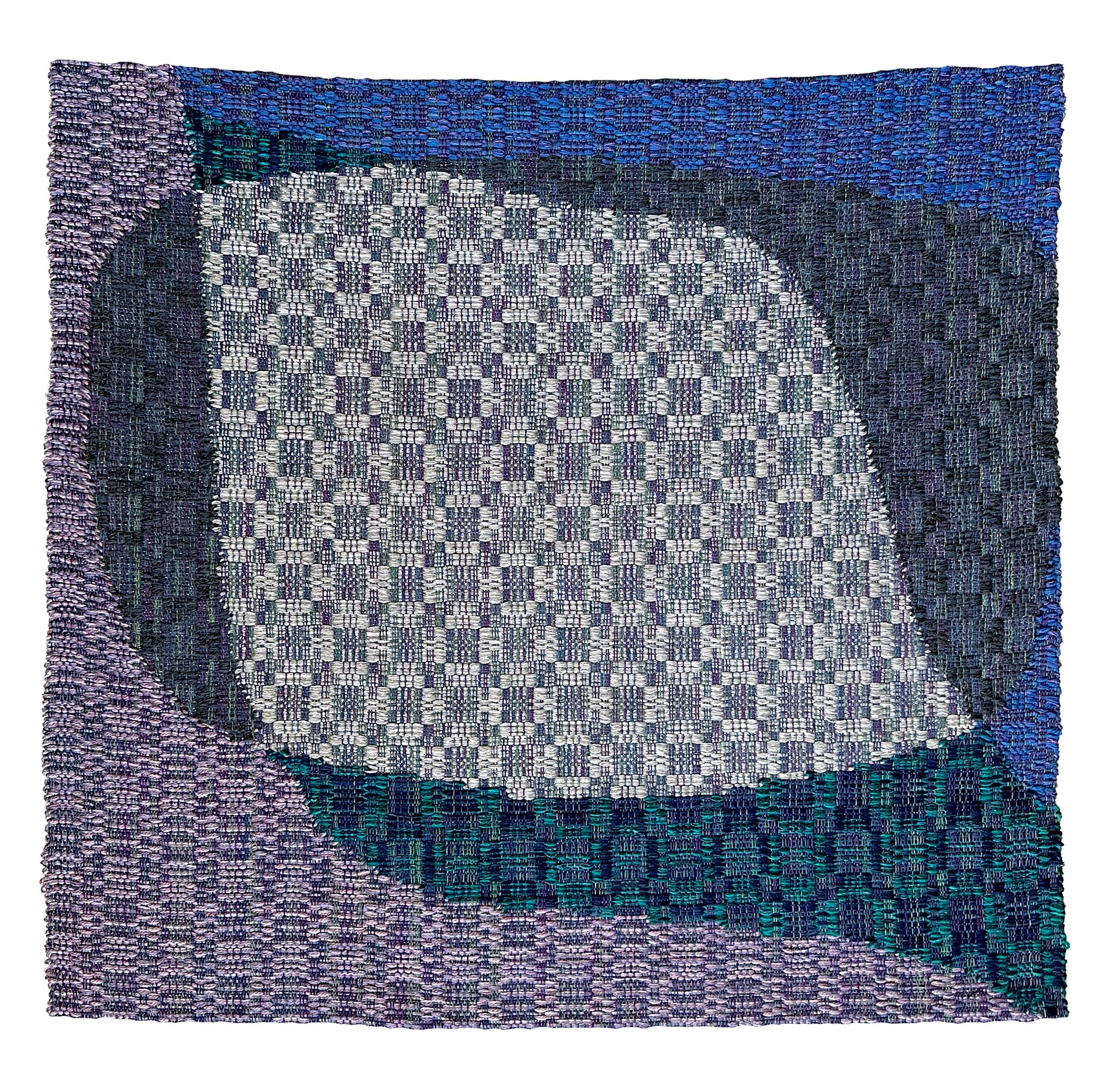 Wildcard Moon, 2025, 27” x 29” Tapestry woven in overshot with wool, tencel, silk and metallic yarns