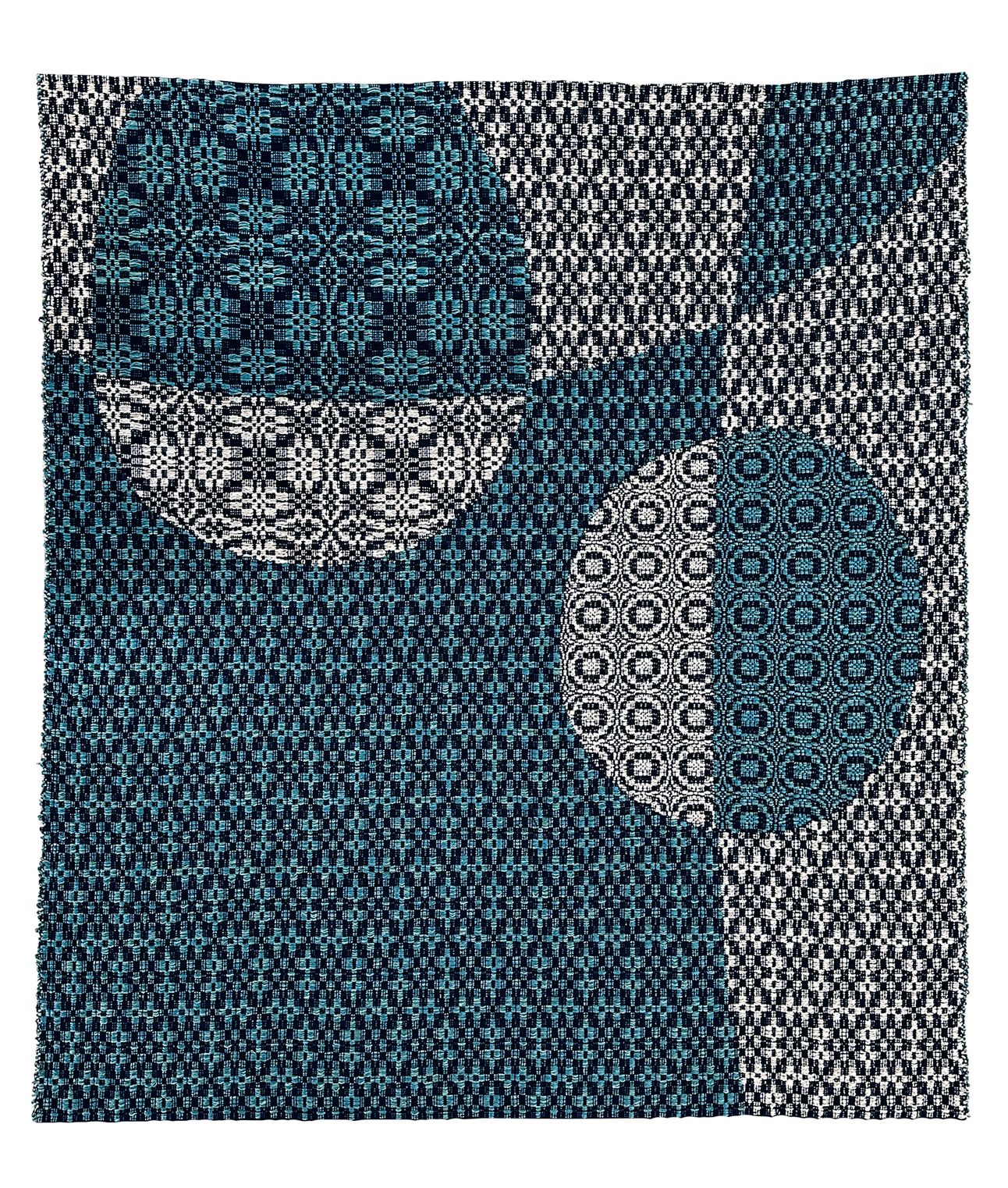 Approaching this work as collage, this piece was mocked up in paper and then translated into a file for Jacquard TC2 in Photoshop. The vintage coverlet patterns, from the Shuttle-Craft Book of American Hand Weaving, were chosen to mimic the bifurcated circles, and the background overshot is based on a pattern by Bertha Gray Hayes. Once chosen, the patterns are squared in Weave-It and then re-squared in Photoshop for use in the weaving. The pattern layout for multi-color weaving with tabby on the Jacquard TC2 is my own design, and this is one of a series of weavings utilizing new squaring methodologies I'm developing for the TC2 specifically.
