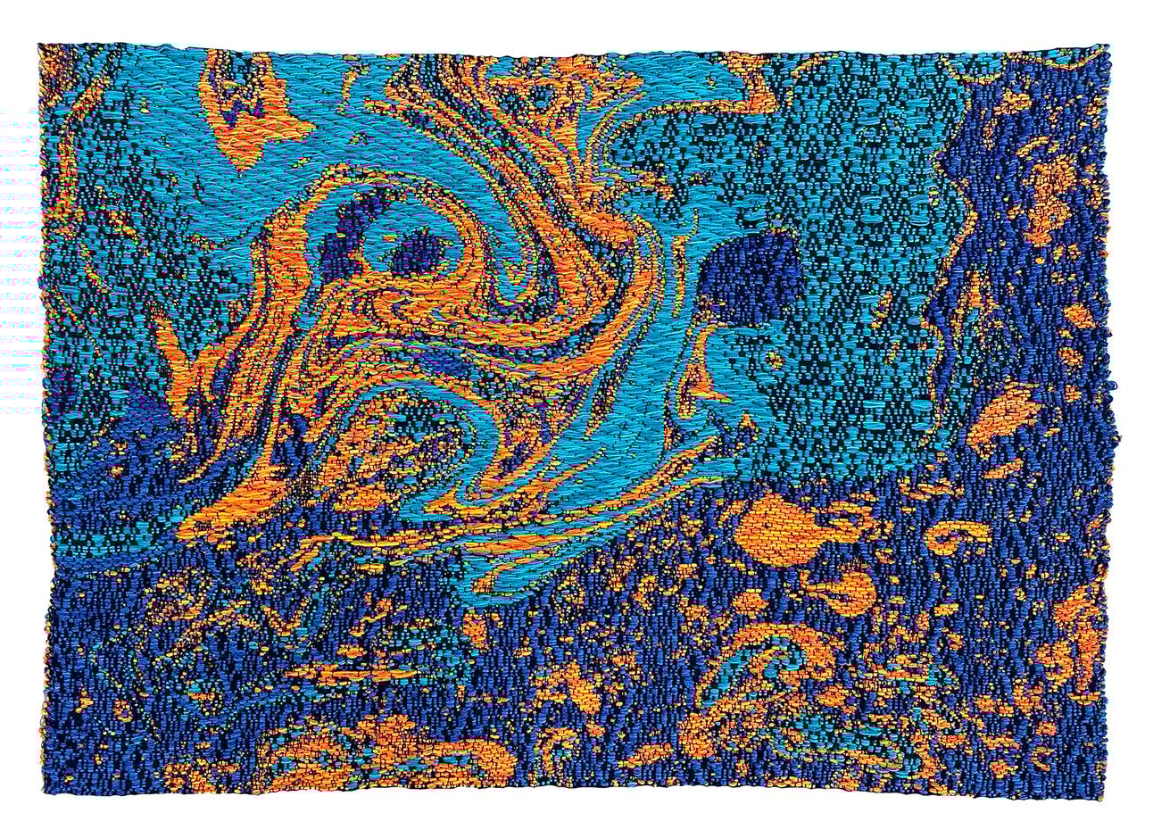 This work is part of a larger series translating photographs from the Great Pacific Garbage Patch into large-scale woven tapestry. The works use beauty as a tool of activism, taking these scenes of trash-filled oceans and elevating them into haunting, ghostly images. Tabby-based patterning plays a role in creating the lush, opulent and textured color fields. In "Synthetic Reflections," the tabby itself is removed from the equation, leaving the patterns loose and floating. The frenetic mix of patterns create a glitchy texture, reinforcing the synthetic aspects of plastic miasma in our oceans.